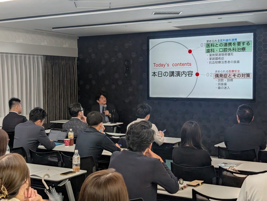 高齢化が進むなか、全身の疾患を抱えながら歯科治療を受ける患者さまが年々増加しています。 今回の講義では、医科との連携が重要となるケースについてご講演いただきました。 全身の疾患を抱えている患者さまには、歯科的な視点だけでなく、 内科的な病状や服薬歴を正しく把握し、適切な診療計画を立てることが求められます。 患者さまの全身状態を考慮したうえで、安全かつ円滑な治療を行うたPXL_20250913_094120894.MP_-1024×771.jpgめの知識と連携のあり方について、再確認する機会となりました。 治療中に起こりうるリスクに備えることも、医療機関として大切な責任です。 川野教授からは、偶発症とその安全対策について詳しくご説明いただきました。 講義では、チームで取り組む医療安全の重要性をあらためて学び、スタッフ一人ひとりが自分ごととして安全意識を高める大変有意義な時間となりました。