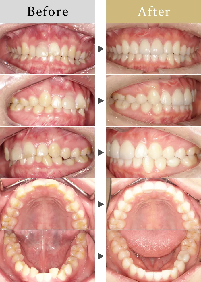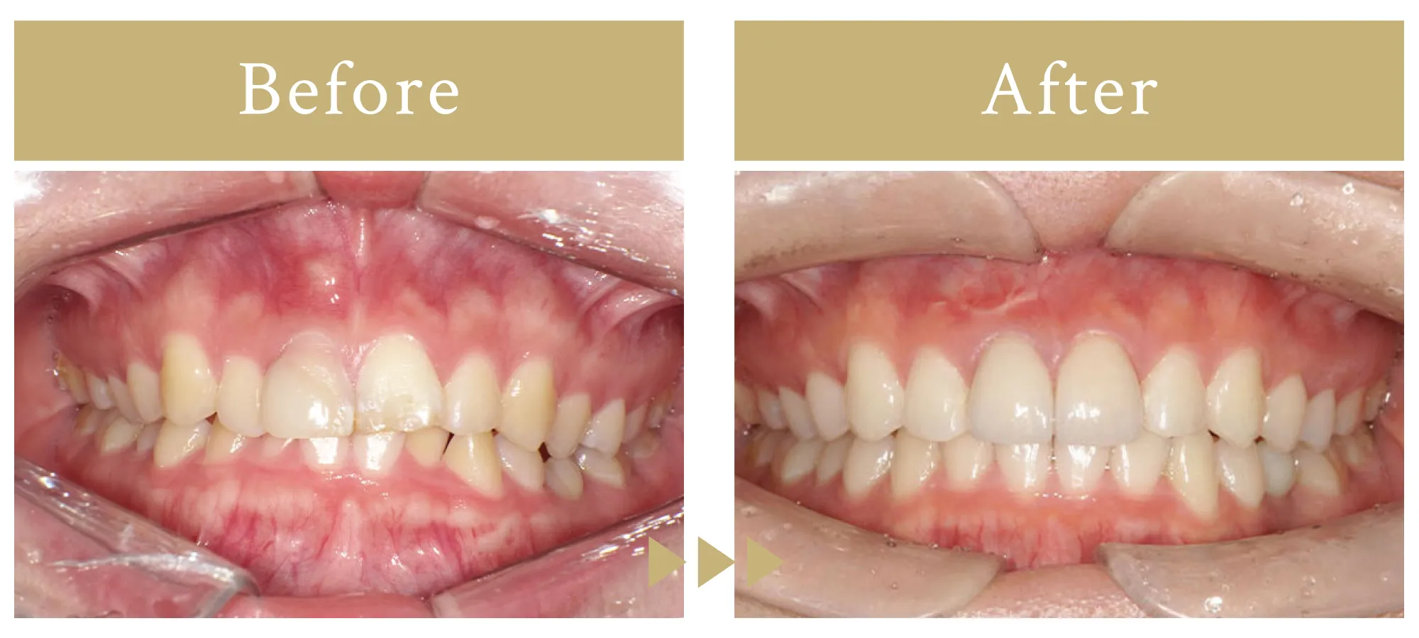 噛み合わせに問題があり、上の前歯が前方に押し出されていたので、矯正をして理想的な噛み合わせ、歯並びにしていきました。